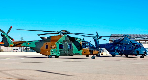 NH90 del EdA y FAMET estacionados en la plataforma de Airbus Helicopters en Albacete. (Foto: @GloriaIllas)