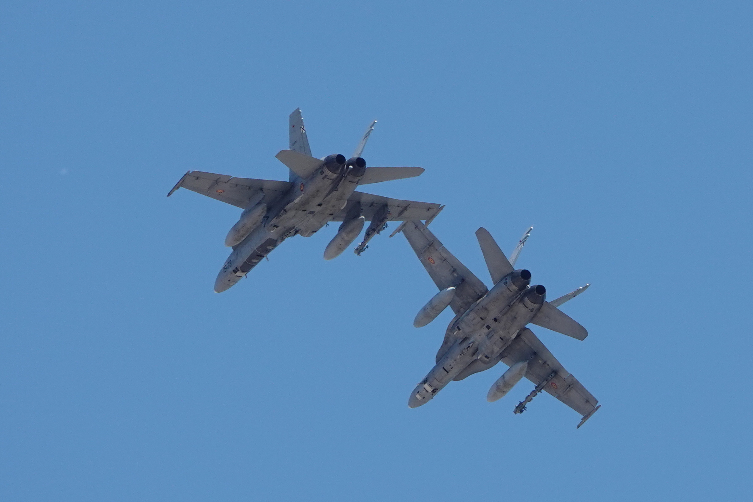 Formación en pareja de dos EF-18BM regresando del polígono de tiro de las Bardanas. Antes de romper y encarar a la 30R (Foto: Fco Javier Chao)