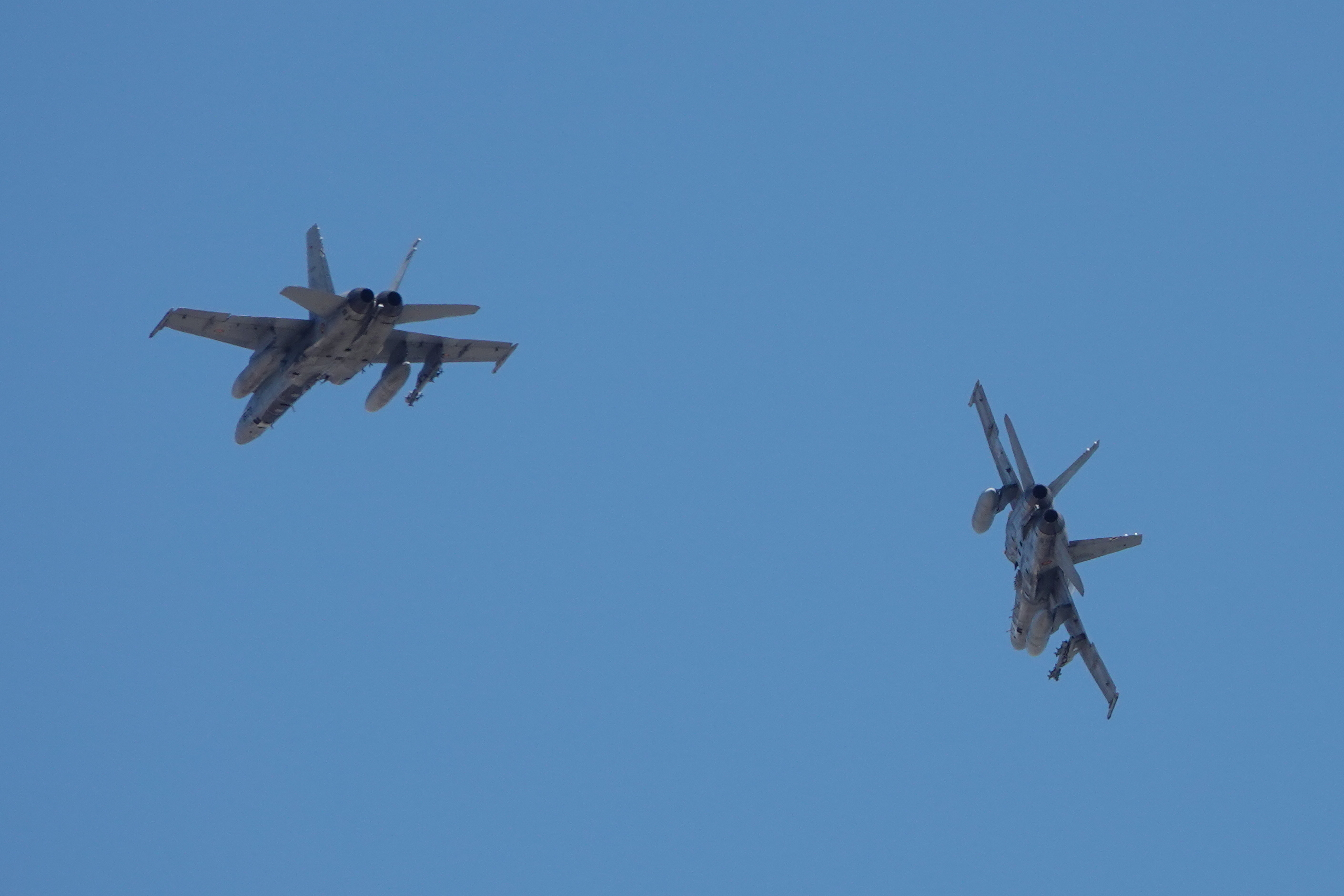 EF-18M regresando del polígono de tiro de las Bardenas. Se puede observar bajo su ala derecha un par de bombetas (azules) inertes para las practicas. (Foto: Fco Javier Chao)