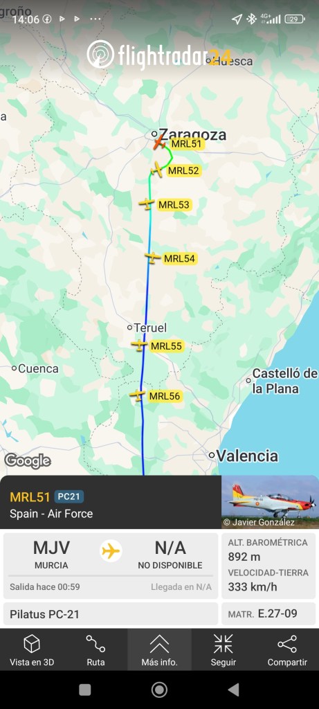 Hoy lunes día 12 de enero de 2026 en Zaragoza hemos podido ver algunos de los PC-21 (E.27) del Ejercito del Aire y del Espacio con los que cuenta la Academia General del Aire con base en la localidad Murciana de San Javier. A partir de las 14:20 hemos podido ver como llegaban a diferentes y escasos intervalos de tiempo, los seis Pilatus con callsing MIRLO, Del MIRLO51 al MIRLO56. Posteriormente partirían de nuevo a San Javier a partir de las cuatro de la tarde. Finalizando de esta manera un vuelo mas de instrucción dentro de los planes educativos en la AGA. Los citados aviones iban pilotados por los alumnos y en la parte trasera pendientes sus instructores.
