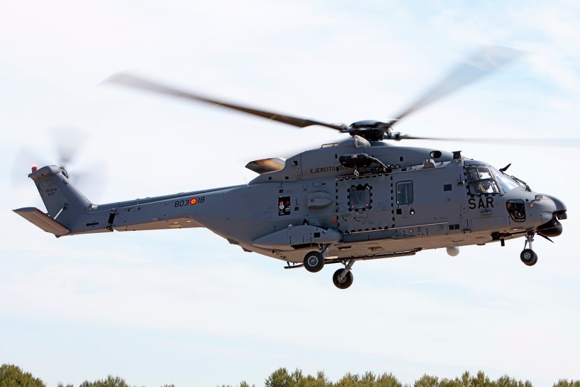 El nuevo NH-90 del EdA «HD.29-18/803-18» que pertenecerá al 803 Escuadrón del Ala 48 con base en Cuatro Vientos. Se puede observar en el costado izquierdo la grúa de rescate. (Foto: Pablo Rada)