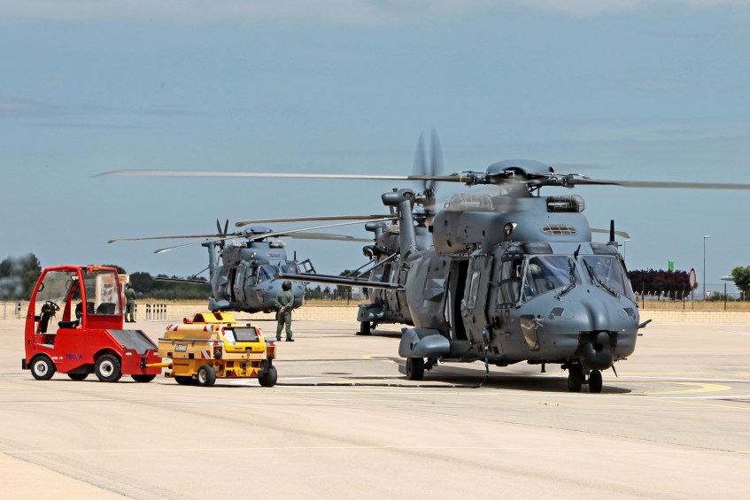 Los tres «Lobos» listos para partir desde Albacete. En formación, el 803-16, 803-17 y por ultimo el nuevo 803-18. SE puede apreciar que solo el del medio el 17 lleva instalada la grúa de rescate sobre su costado derecho. (Foto: Pablo Rada)