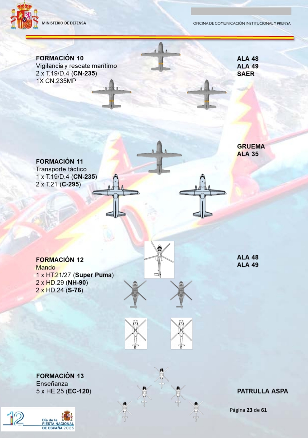 6 helicópteros H175M: Para el Ejército del Aire y del Espacio. Estos helicópteros utilitarios supermedios se utilizarán en misiones gubernamentales, incluyendo el transporte de autoridades, y sustituirán a las flotas obsoletas del Ala 48.