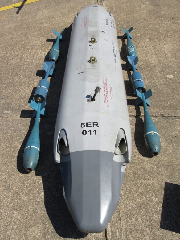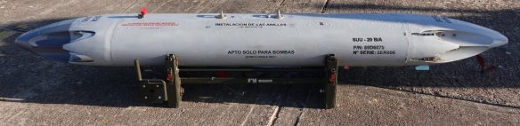 Contenedor SUU-20 donde se enganchan en la parte inferior las bombetas inertes. En los extremos se pueden observar dos tipos de bombetas inertes, entre ellas las BDU-33. (Imagen: Fco javier Chao)