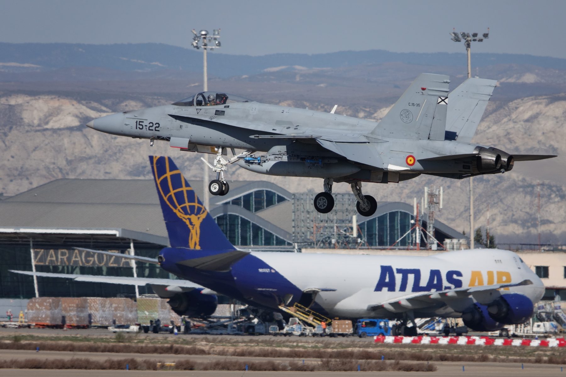 EF-18M (C.15-29/15-16) aterrizando por la 30R al fondo una de las terminales de carga del aeropuerto de zaragoza. (Imagen: Fco Javier Chao)