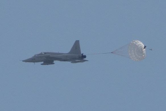 La imagen curiosa el AE.9-10 / 23-04 que tras una aproximación desplego el paracaídas de frenado y que posteriormente se deshizo del mismo en las proximidades aterrizando posteriormente.