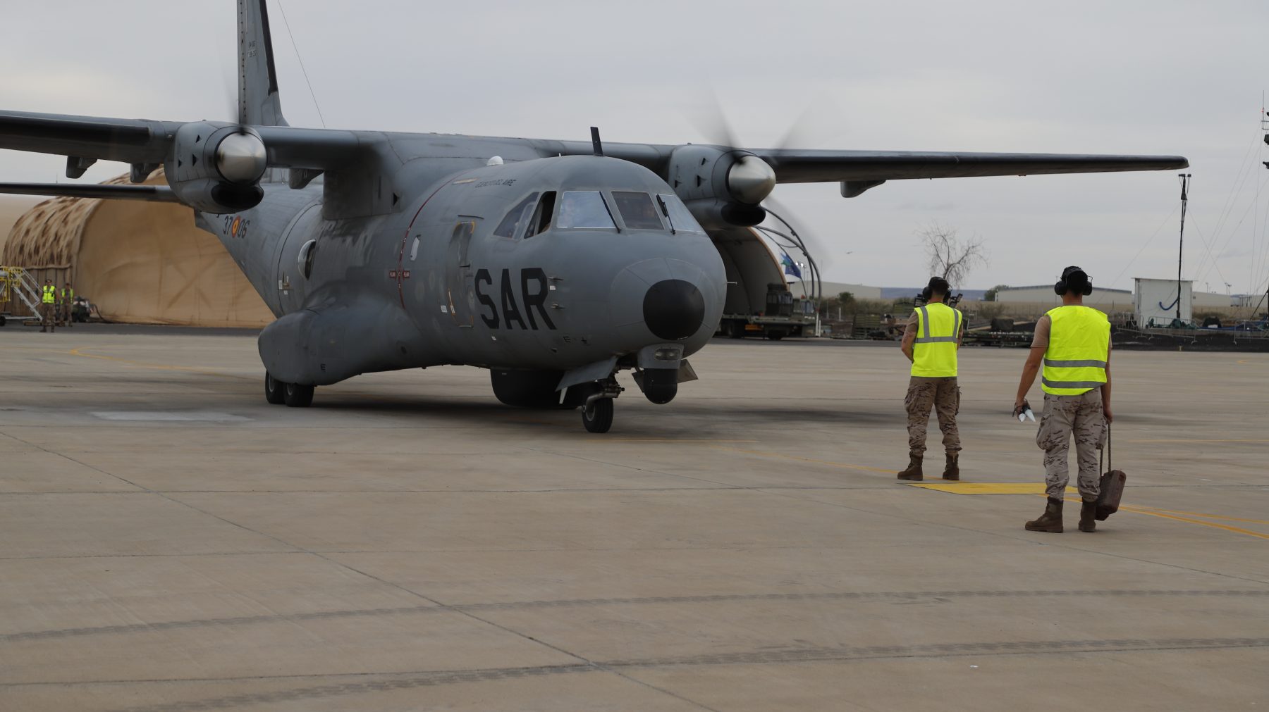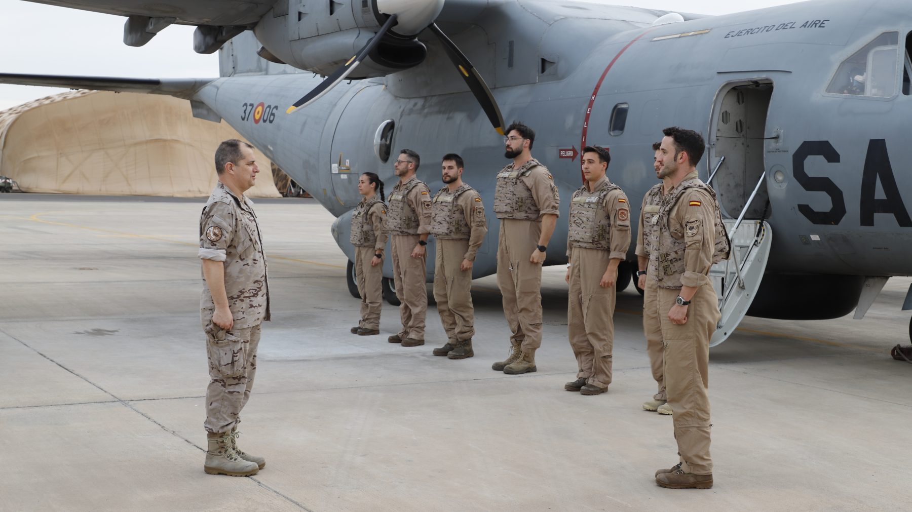 Tripulación del 802 Escuadrón del Ala46 desplazado a Yibuti con el CN235 (D.4) Se puede observar como portan el chaleco de supervivencia. A su llegada a la BA 188 en Yibuti. (Imagen:@EMADmde)