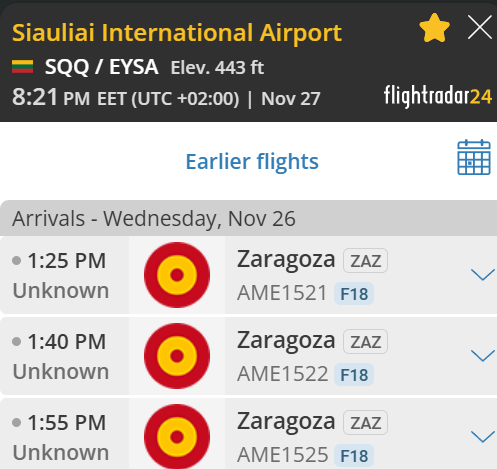 - 26 de noviembre @flightradar24 informa de tres vuelos de EF-18M con callsing AME151, AME152 y AME153 desde Zaragoza a Siauliai.