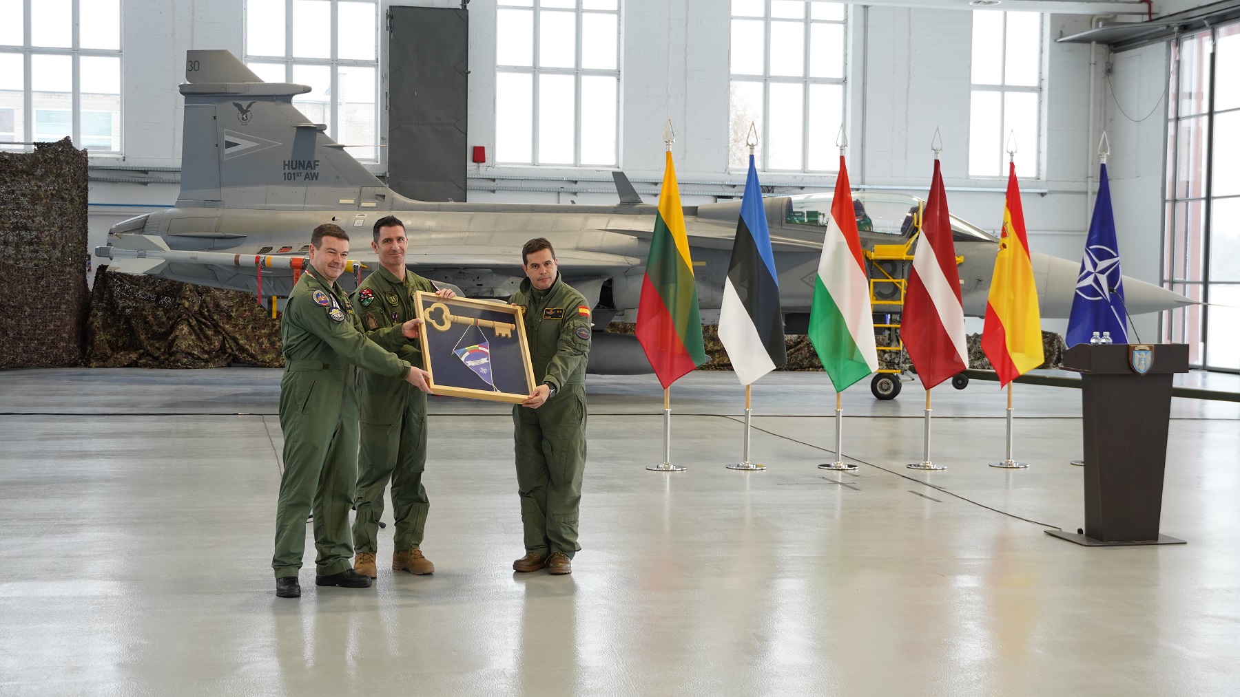 Acto de entrega de llaves, relevo entre el personal Español, finaliza el Ala 11 y entra el Ala 15. Detrás junto a un JAS-39 Húngaro, las banderas de los Países Bálticos, Hungría, España y la OTAN. (Imagen: https://kam.lt)