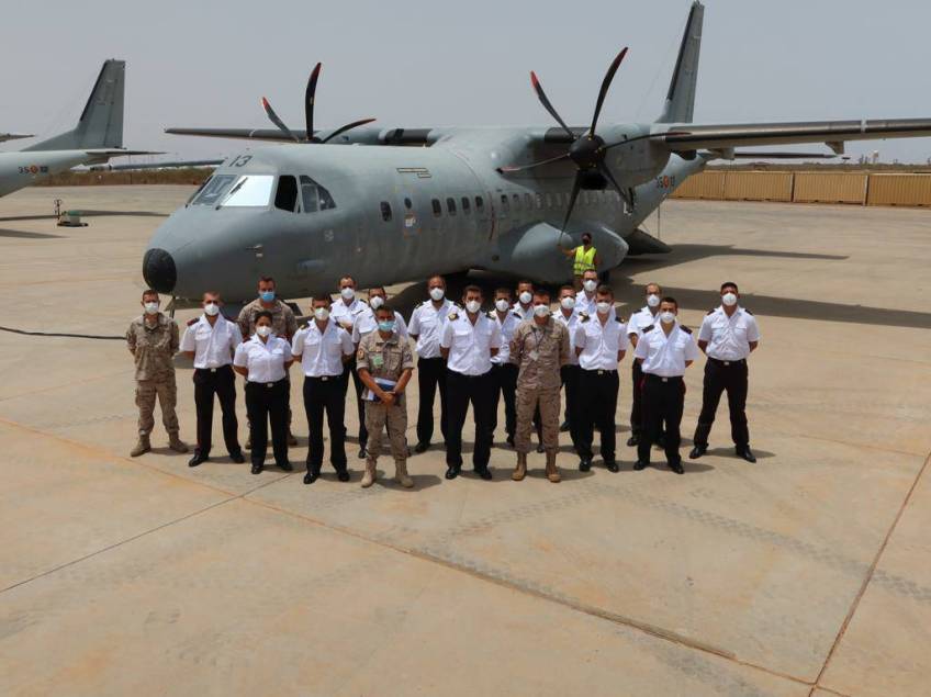 Personal del BAM «Furor» de la Armada Española visitando el «Destacamento Marfil». Se puede observar en la foto (Imagen:@EMADmde) los dos aviones C-295 destacados en Senegal. Los T.21-12/35-12 y T.21-13/35-13.