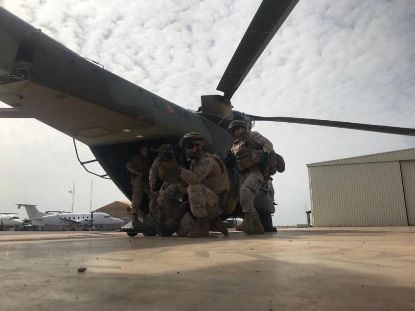 Personal de IM de la Armada realizando ejercicios CASEVAC con el helicóptero de las FAMET NH-90 destacado en Bamako (Mali) dentro del operativo del EUTM-Mali. (Imagen:@EMADmde)