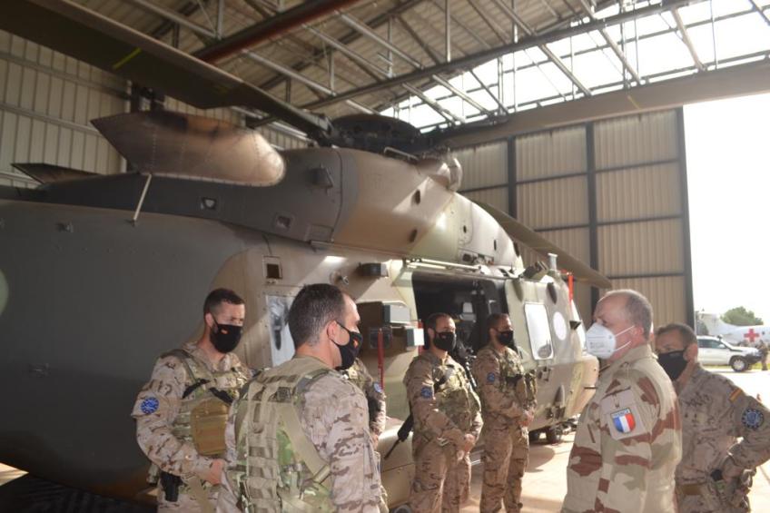 Visita del Jefe del estado Mayor de la Unión Europea al destacamento de la MASPUHEL. Se puede observar el NH-90 en su hangar en el aeropuerto de Bamako. (Imagen:@Defensagob)