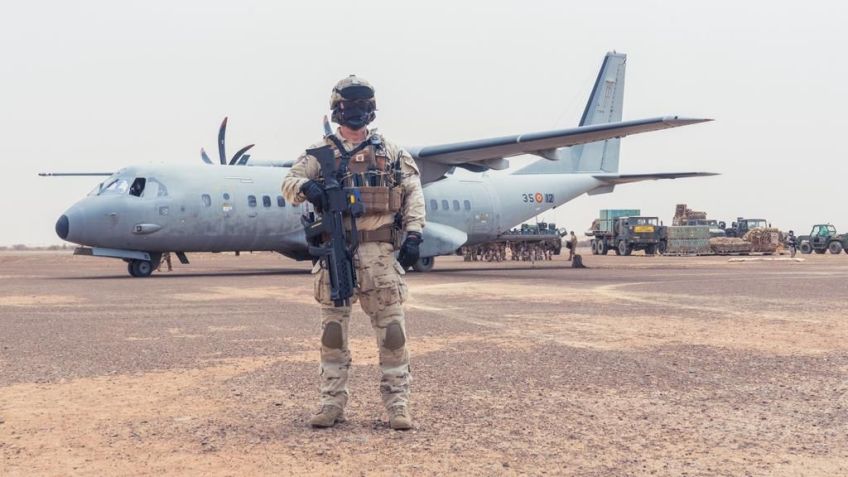 Típica misión del Destacamento Marfil. Se puede ver a uno de los dos C-295 destacados y en esta imagen se puede ver el despliegue de seguridad por parte de la EADA al rededor del T.21 mientras cargan material. (@EMADmde)