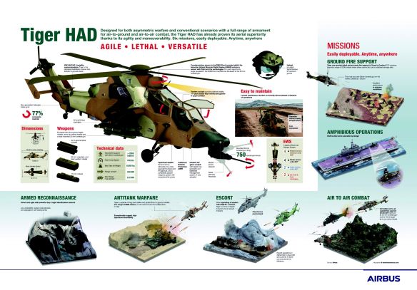 - Armamento: Cañón automático GIAT/Nexter de 30 mm. (450 proyectiles) / Lanzadores dobles o cuádruples con Misiles aire-aire Mistral / 2 lanzaderas de 4 Misiles contra-carro Spike ER ( solo el HAD) / Cohetes de 68 mm de TDA con lanzadores de 12 y 22 alveolos para la versión (HAP) y Cohetes de 70 mm de FZ con lanzadores de 19 y 7 alveolos o celdas para la versión (HAD).
