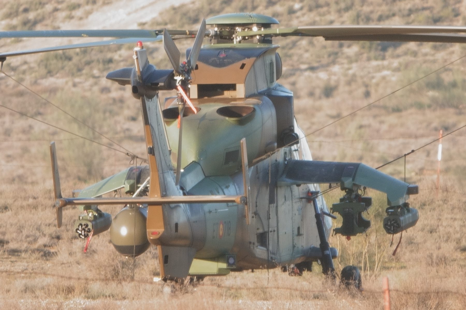 En este Tigre se puede observar de izquierda a derecha lanzadera de 7 celdas, deposito de combustible externo, lanzadera de misiles Spike y por ultimo otra lanzadera de 7 celdas. (Imagen: Fco Javier Chao)