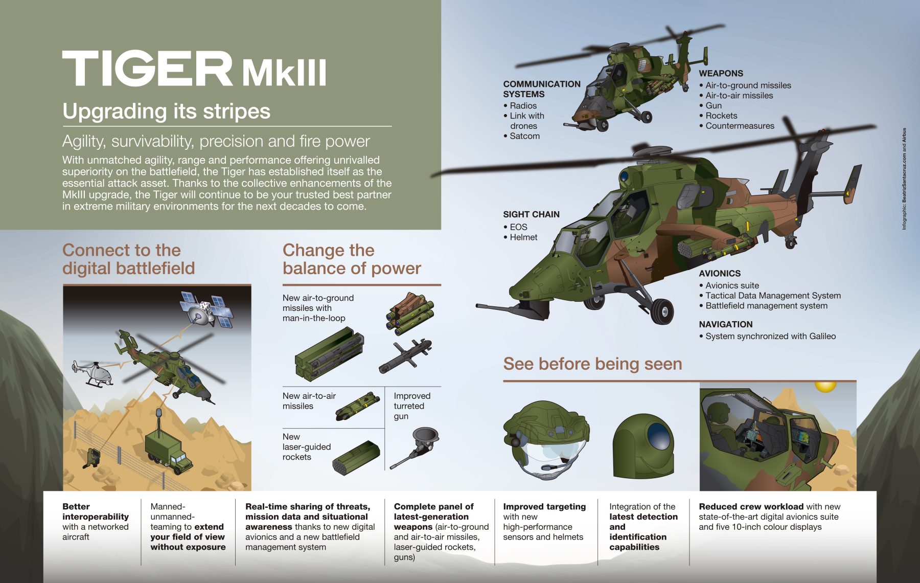 El nuevo estándar permitirá que la plataforma esté totalmente conectada al campo de batalla digital para realizar integración de equipos tripulados y no tripulados, así como para compartir información táctica en tiempo real. También proporcionará una gama de armamento (cañón de torreta, cohetes guiados por láser y misiles) y un renovado sistema optrónico. El Tigre MkIII también reducirá la carga de trabajo de la tripulación gracias a la integración de una aviónica de última generación que permitirá a la tripulación centrarse plenamente en la ejecución de la misión.