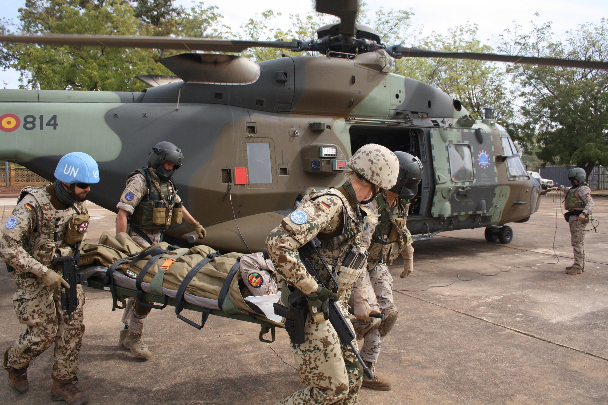 - 6 de febrero el @EMADmde informa sobre un simulacro de la MASPUHEL con personal sanitario de EUTM y MINUSMA. En el que se puede observar uno de los tres helicópteros destacados en Mali. (HT.29-14/ET-814)