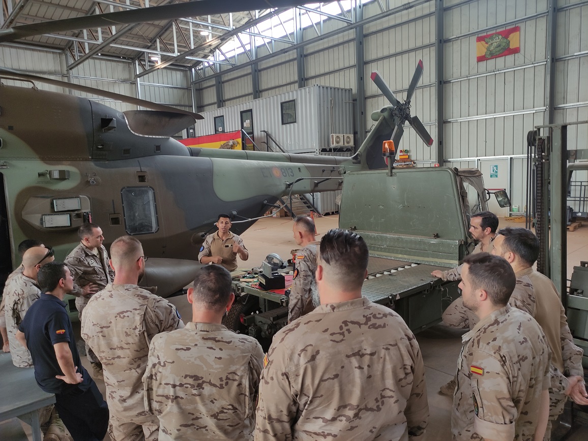 Personal de apoyo y mantenimiento del Destacamento MASPUHEL en su base en Bamako (Mali). Se puede observar el NH-90 (HT.29-14/ET-814) Imagen:@EMADmde