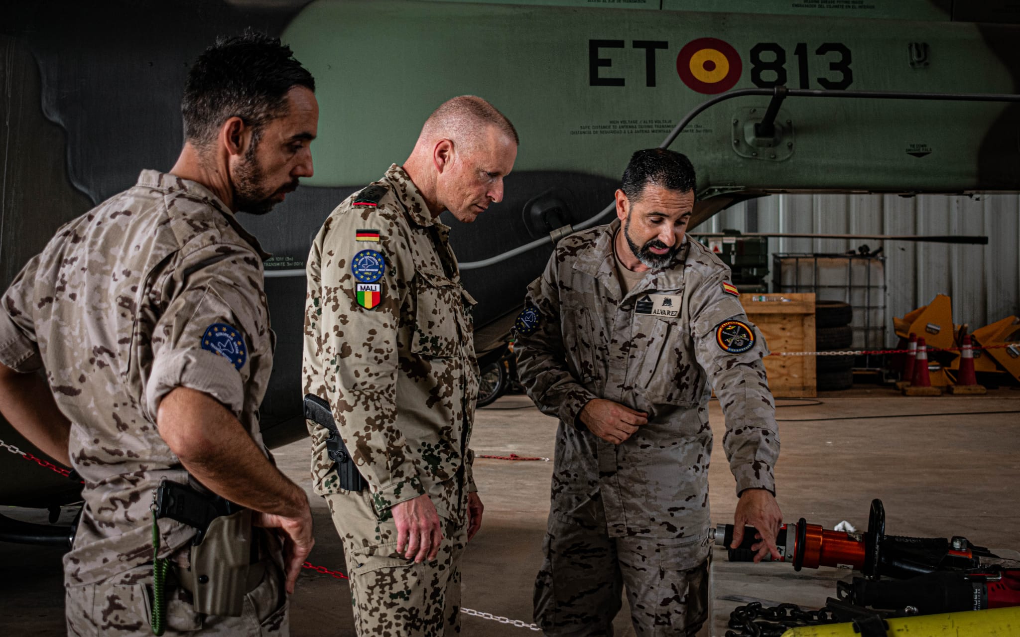 - 9 de febrero el @EMADmde publica una serie de fotos en las que se puede ver a mecánicos del destacamento trabajar sobre los NH-90 en su base de Bamako (Mali).