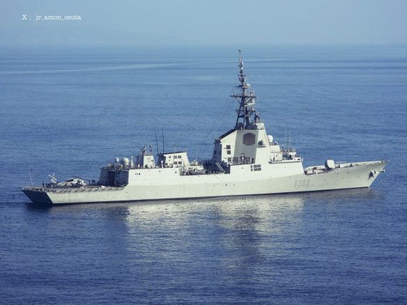- 23 de junio @jr_amon_ceuta informa sobre la vista de la Fragata Blas de Lezo durante el paso del estrecho. Se observa sobre su cubierta del helicóptero SH-60B.
