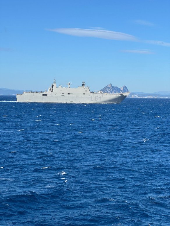 - 1 de febrero gracias a las imágenes de @jr_amon_ceuta podemos observar los buque del Grupo Expedicionario de Combate «Dédalo25-1»durante su travesia por el estrecho de Gibraltar. El JCI en cuya cubierta se pueden observar tres de los AV-8B Harrier, en la Fragata «Victoria» sobre su cubierta de vuelo se ve perfectamente su UNAEMB constituida por el helicóptero SH-60B. Se observan también las Fragatas Álvaro de Bazán y Blas de Lezo, así como el BAC «Patiño».
