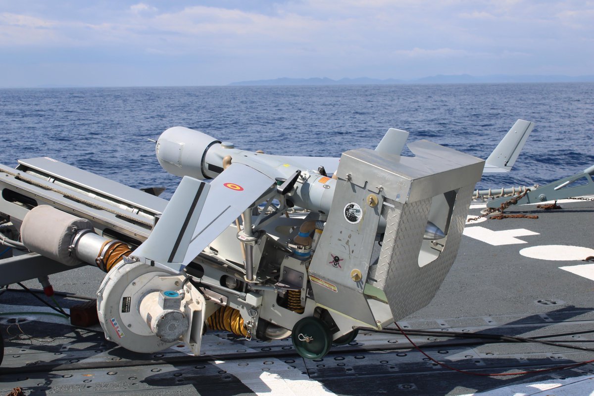 El UAV «Scan Eagle» sobre la catapulta de aire comprimido. Lanzador Mark 4 en la cubierta de vuelo de la Fragata «Reina Sofia». (Imagen: @EMADmde)
