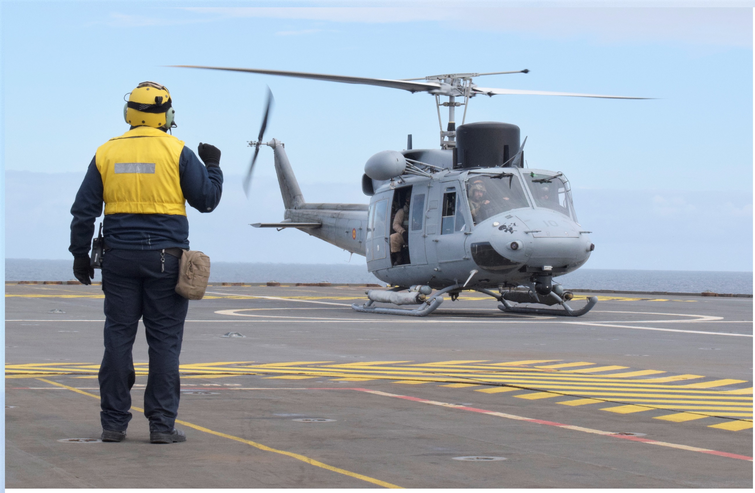 El helicóptero AB-212 perteneciente al Grupo «DEDALO24» sobre la cubierta del Buque Frances «Mistral». (Imagen: @EMADmde)