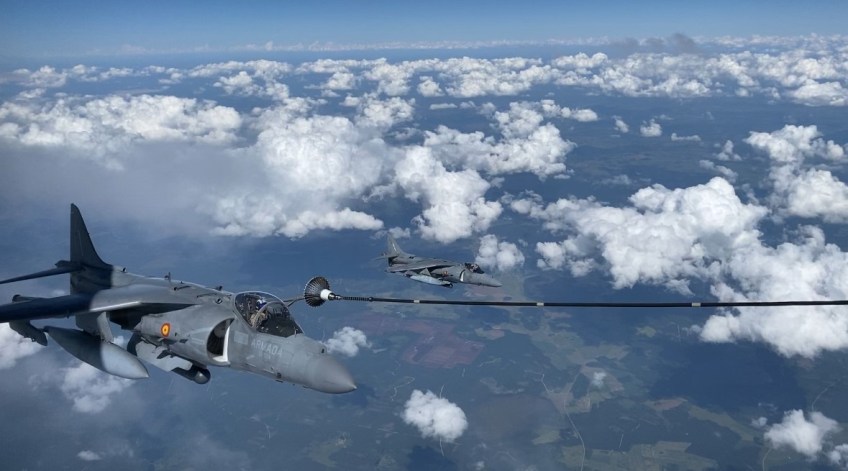 240704-foto1-harrier-a400 Publicado el 08/07/2024 a 1179 × 655 en Grupo De Combate Expedicionario «Dédalo 24» Uno de los AV-8B Harrier siendo reabastecidos por uno de los A400 del destacamento VILKAS en Lituania. (Imagen: EMAD) Comparte esto:Entrada Compartir en WhatsApp (Se abre en una ventana nueva) WhatsApp Enviar un enlace a un amigo por correo electrónico (Se abre en una ventana nueva) Correo electrónico Imprimir (Se abre en una ventana nueva) Imprimir Me gusta Cargando...
