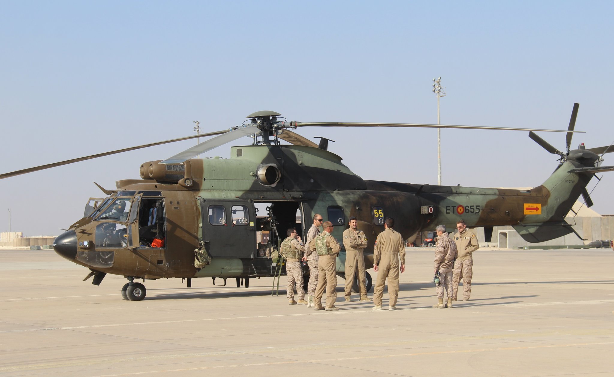 9.000 horas de vuelo de la Task Force Toro. En la imagen personal del XIX contingente detrás uno de los helicópteros Cougar destacados en la BA de Al Asad en Irak. (Imagen: @Defensagob)