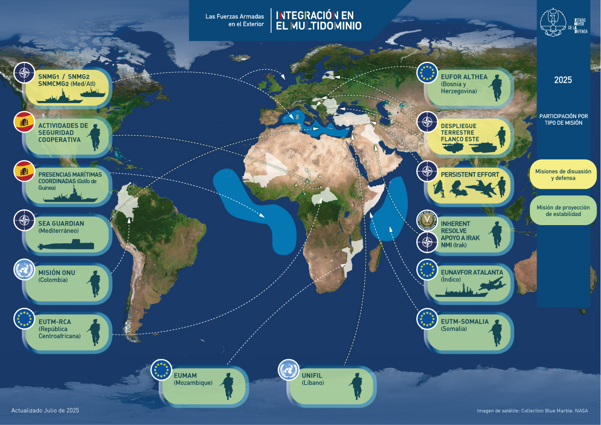 El Consejo de Ministros el día 17 de diciembre de 2.024 aprobó el acuerdo por el que se prorroga hasta el 31 de diciembre de 2.025 la participación de de las Fuerzas Armadas y Guardia Civil españolas en operaciones fuera del territorio nacional. Para el año 2025 se plantea un esfuerzo militar en el exterior similar al de 2024, con ajustes numéricos puntuales en algunas misiones, derivados de su evolución o de los compromisos y rotaciones acordados en los procesos de generación de fuerzas de la Unión Europea y la Alianza Atlántica.