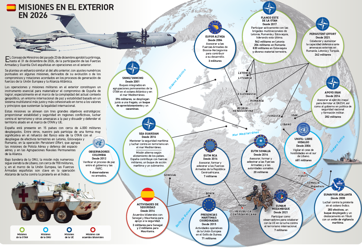 El Consejo de Ministros del día 23 de diciembre de 2025 aprobó el acuerdo por el que se prorroga hasta el 31 de diciembre de 2.026 la participación de de las Fuerzas Armadas y Guardia Civil españolas en operaciones fuera del territorio nacional. Para el año 2026 se plantea un esfuerzo similar al del año anterior, con ajustes numéricos puntuales en algunas misiones, derivados de su evolución o de los compromisos y rotaciones acordados en los procesos de generación de fuerzas de la Unión Europea y la Alianza Atlántica