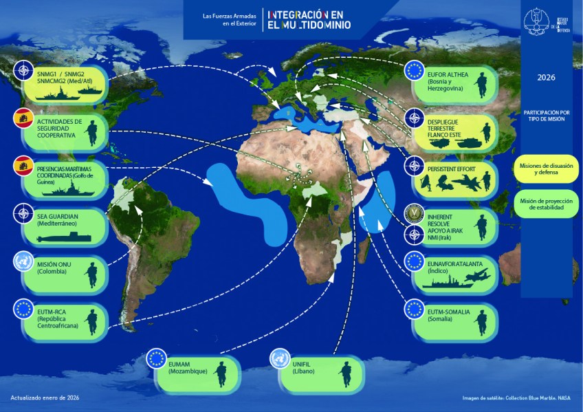 Mapa operaciones en el exterior. Misiones Internacionales en las que participa España. 2026 (Fuente: MOPS/EMAD)