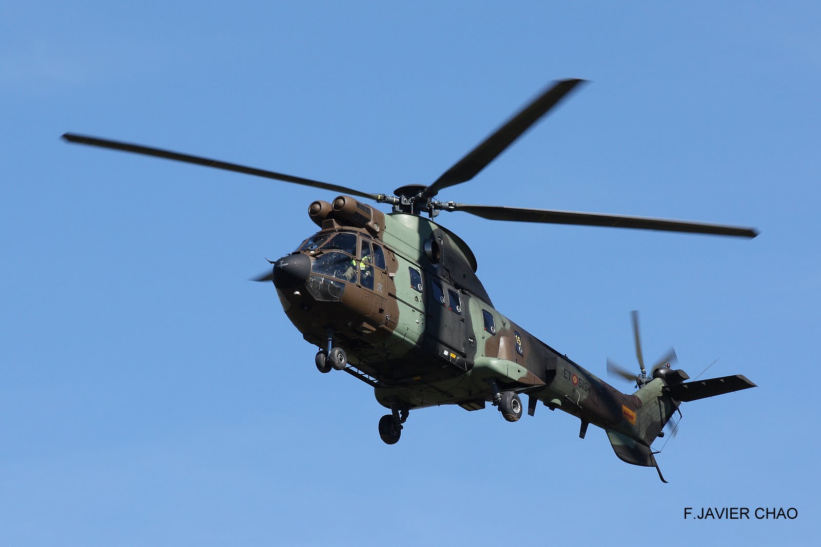 AS332 Super Puma (HU.21) perteneciente al Batallón de Helicópteros de Maniobra nº4 (BHELMA IV), Batallón de Transmisiones (BTRANS), Batallón de Helicópteros de Maniobra nº6 (BHELMA VI). Con 16 aparatos en la actualidad. Cuya misión principal es el transporte.