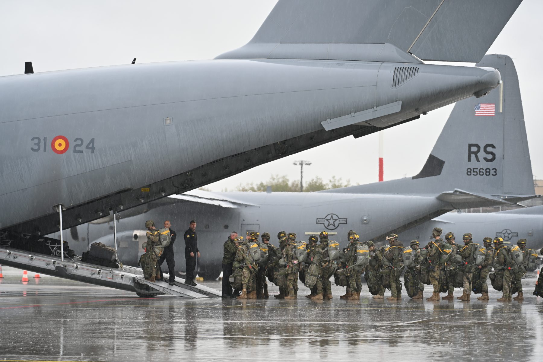 Paracaidistas Españoles de la Brigada «Almogávares VI» de la BRIPAC embarcando en uno de los A400 (T.23) del Ala 31 en el aeropuerto internacional de Riga el 16 de mayo (Imagen: U.S. Army photo by Staff Sgt. Randis Monroe)