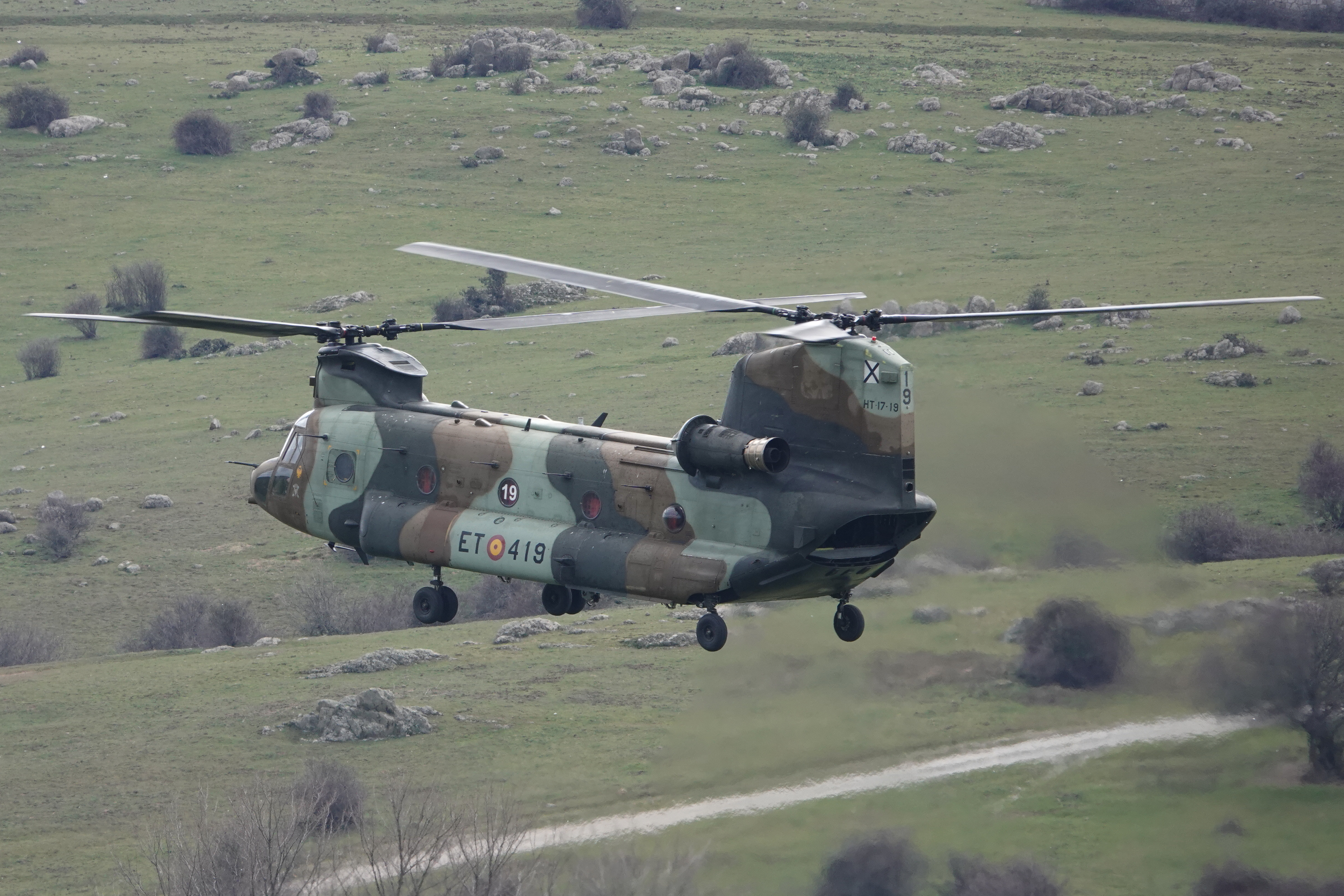 EC-135 (HE.26-03 / ET-181) Foto: Fco Javier ChaoEC-135 (HE.26-05 / ET-183) Foto: Fco Javier ChaoEC-135 (HE.26-20 / ET-184) Foto: Fco Javier ChaoEC-135 (HE.26-25 / ET-189) Como curiosidad se puede ver a los tripulantes saludar. Lo que naturalmente se agradece. (Foto: Fco Javier Chao) Los EC-135 de la UME con su característica librea amarilla y roja. Bajo la cabina la torreta o bola FLIR. HE.26-11 / ET-197 (Foto: Fco Javier Chao) Super Puma AS332 (HU.21-08 / ET-502) perteneciente al BTRANS uno de los dos Super Puma VIP que tiene la citada unidad. (Foto: Fco Javier Chao)CH-47D Chinook (HT.17-19 / ET-419) uno de los pocos «D» que aun vuelan, realizando tomas en los exteriores de la base. (Foto: Fco Javier Chao) CH-47D Chinook (ET-419) se pueden observar el ET-405 y el ET-402 (previsiblemente preparados para la próxima transformación a «F») Foto: Fco javier ChaoCH-47F (HT.17-21A / ET-421) se puede observar los dos últimos ventanales tipo pez lo que facilita al operador observar con mayor facilidad el exterior. (Foto: Fco javier Chao)El CH-47F Chinook (HT.17-21A / ET-421) llego a España el 8 de febrero de 2022 vía aérea a la Base Aérea de Torrejón en un avión C-17 de la USAF (Foto: Fco Javier Chao)El ET-421 realizando diferentes circuitos en las proximidades de su base en Colmenar Viejo (Foto: Fco Javier Chao)CH-47F (HT.17-23A / ET-423) estacionado en plataforma. Este aparato llega a España vía marítima por el puerto de Santander el 1 de junio de 2022. (Foto: Fco Javier Chao)Otra imagen del ET-423 con la nueva librea de los Chinook «Foxtrot» (Foto: Fco Javier Chao)Realizando practicas de carga enganchado a uno de los tres ganchos exteriores con los que cuenta el CH-47F Chinook. (Foto: Fco javier Chao)En esta imagen el CH-47F Chinook (ET-423) con dos cargas externas. (Foto: Fco Javier Chao)Desde esta perspectiva se puede observar perfectamente la situación de los tres ganchos externos que llevan los CH-47F Chinook y con la compuerta central abierta. (Foto: Fco Javier Chao)Detalle del gancho externo central desde donde cuelga la carga externa. Se aprecian los otros dos ganchos laterales al central. CH-47F Chinook del BHELTRA V con base en Colmenar Viejo. Perteneciente a las FAMET(Foto: Fco Javier Chao)
