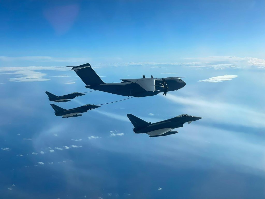 Los cuatro Eurofighter (C.16) pertenecientes al Destacamento Strela en Bulgaria fueron reabastecidos por un A400 a su regreso a España tras finalizar su misión como eAP.