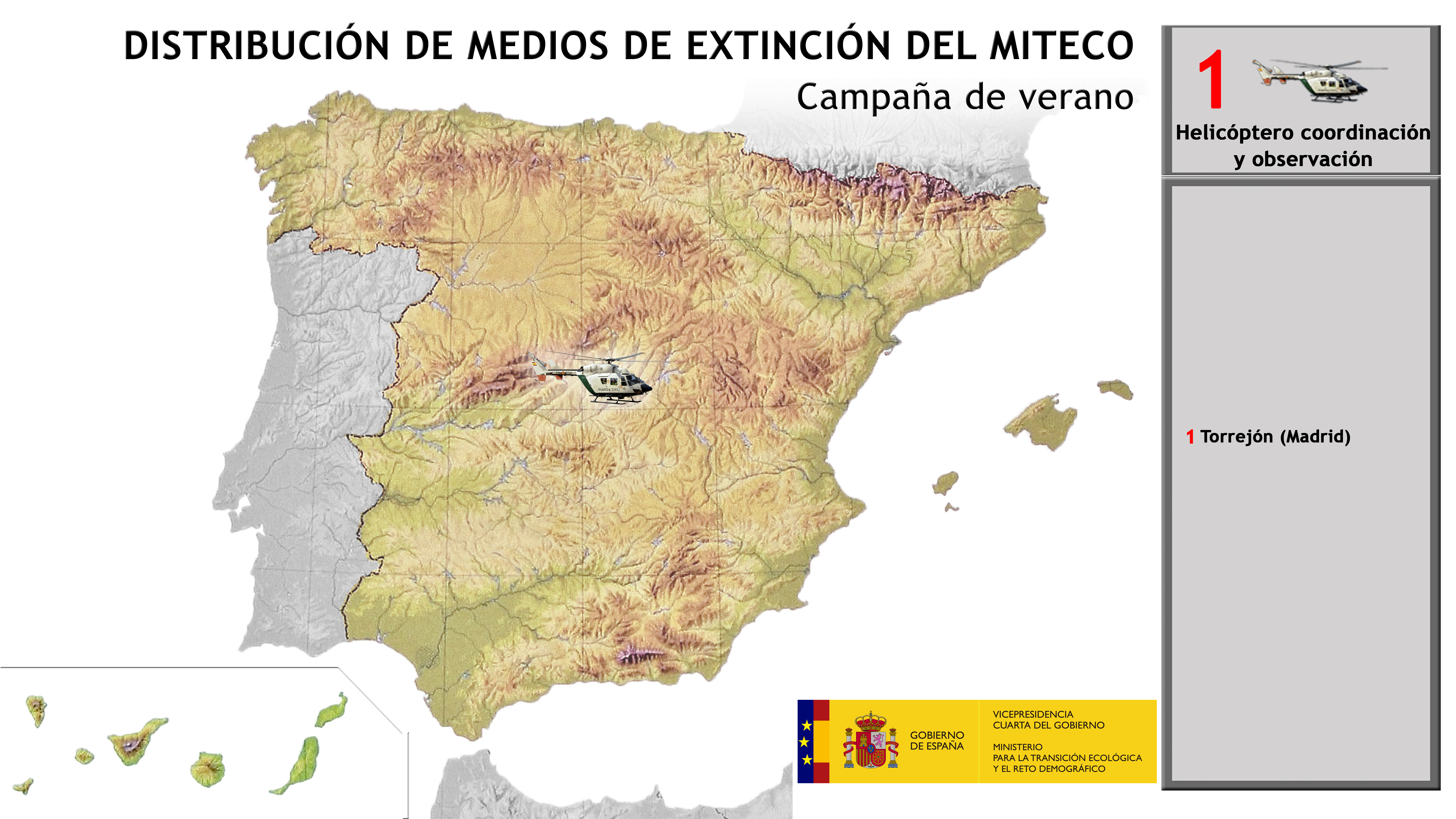 Para la lucha contra los incendios forestales el Gobierno dispone de medios aéreos del MITECO que son de su propiedad pero que debido a diferentes convenios con el Ministerio de Defensa y Guardia Civil son volados y mantenidos por el Ejercito del Aire los 18 aviones anfibios (AA) CL-215 y CL-415 que vuelan en el 43 Grupo con base en Torrejón y que en la campaña de verano se despliegan en diferentes puntos como se puede ver en el mapa facilitado por el MITECO.