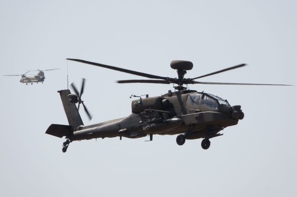 Aproximación del AH-64 tras señalizarles la tripulación del Chinook el lugar a aterrizar. Posteriormente tras aterrizar los tres Apaches aterrizo el CH-47F.