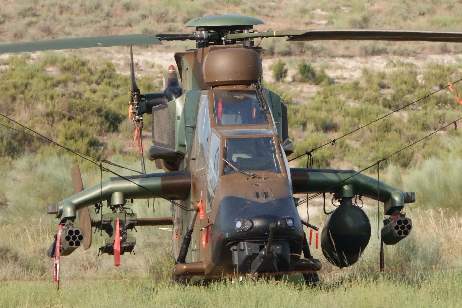 El potencial del «Tigre» de izquierda a derecha, lanzador de 7 celdas para cohetes de 70mm, lanzadera para los misiles Spike ER, cañón automático GIAT/Nexterde 30mm, deposito de combustible externo y otro lanzador de 7 celdas. Se observan también las diferentes cintas rojas de seguridad (Remove Before Flight)