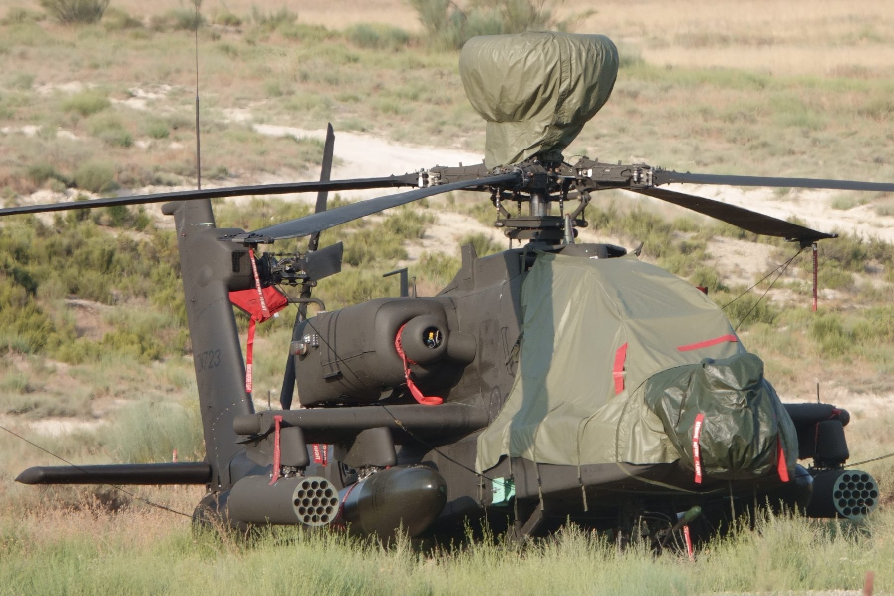 En todo momento mientras estaban estacionados se encontraban cubiertas las zonas mas sensibles para protegerlas del polvo y posibles piedras. AH-64 (ZM723) con sus lanzadores de cohetes y depósitos de combustible externos.