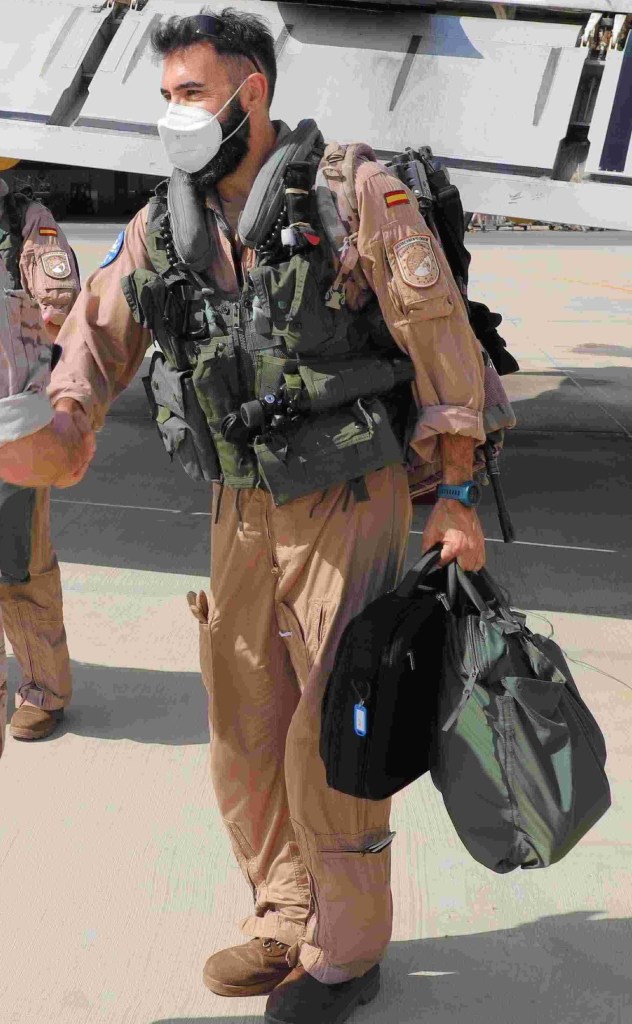 Foto en la que se puede observar la uniformidad de un tripulante del P-3 Orion en una típica misión de vigilancia. Bolsa de vuelo y chaleco táctico y supervivencia. (Imagen:@EMADmde)