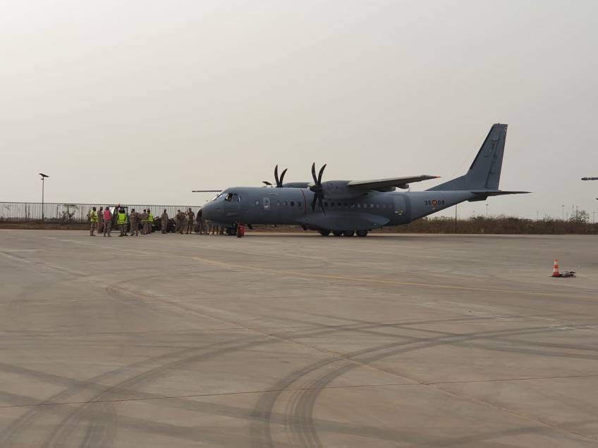 El C-295 con matricula T.21-09/35-09 fue el encargado de realizar el relevo del personal desde Getafe a la BA de Blaise Diagne (Senegal) tras hacer una parada técnica en la base aérea de Gando. (Imagen: @ EMADmde)