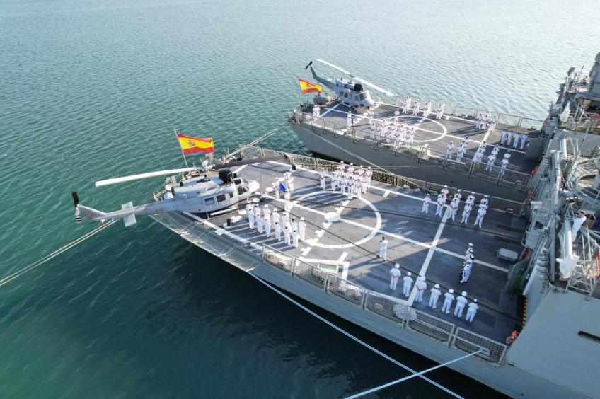 Relevo de la Fragata Navarra por la Victoria en aguas Indicas. Se puede observar como ambas llevan como UNAEMB un helicóptero AB-212. (Imagen: @EMADmde)