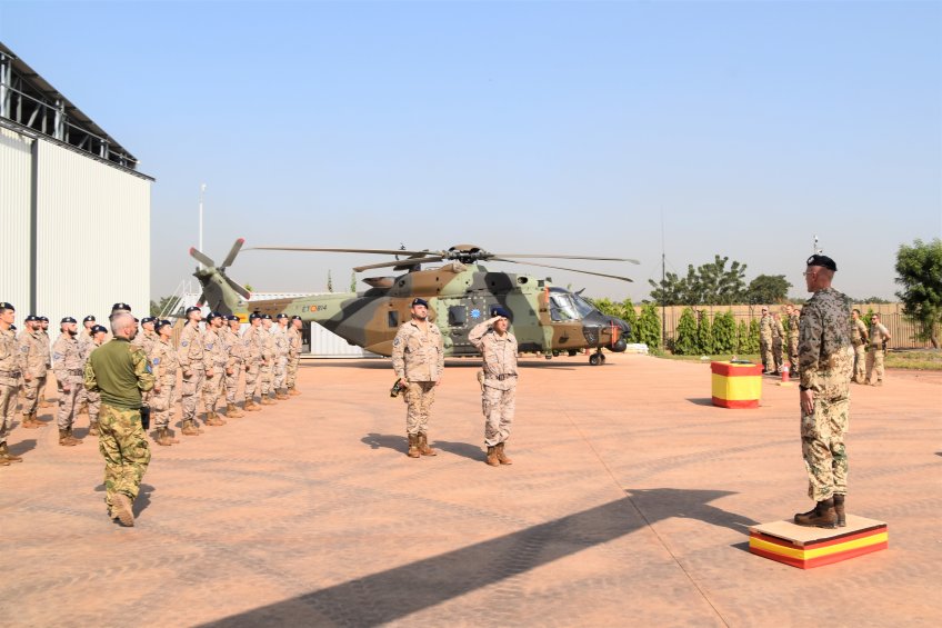Entrega de medallas al personal de la «MASPUHEL» de las FAMET destacadas en Bamako. Al fondo se puede ver uno de los tres NH-90 destacados. (Imagen: @eutmmali)