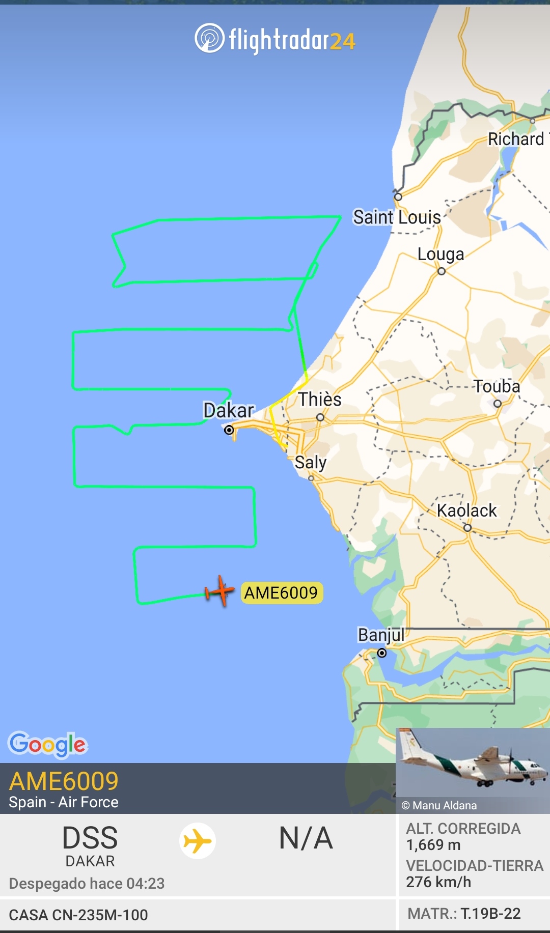 Una de las típicas patrullas del CN-235 del GRUPAV del SAER durante una de sus patrullas frente a las costas de Senegal. Callsing AME6009 (Imagen: @flightradar24)