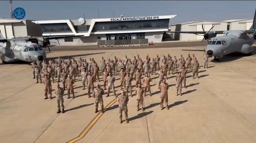 Personal del «Destacamento Marfil» felicitando las Navidades desde Senegal. Detrás los dos C295 (T.21-06/35-06 y T.21-08/35-08) pertenecientes al Ala 35 de Getafe. (Imagen:@EMADmde)