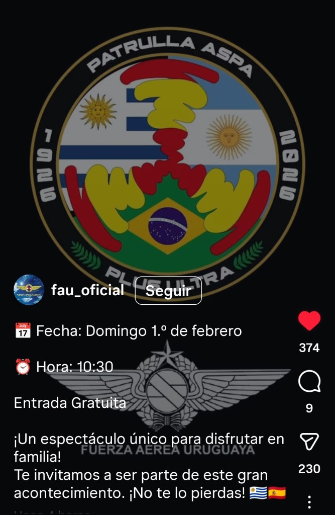 Cartel de la Fuerza Aerea uruguaya en las RRSS Publicado el 22/01/2026 a 1080 × 1659 en Cartel de la Fuerza Aerea uruguaya en las RRSS Cartel de la Fuerza Aerea uruguaya en las RRSS Descubre más desde AERONAVES MILITARES ESPAÑOLAS Suscríbete y recibe las últimas entradas en tu correo electrónico. Escribe tu correo electrónico… Suscribirse Comparte esto:Entrada Compartir en WhatsApp (Se abre en una ventana nueva) WhatsApp Enviar un enlace a un amigo por correo electrónico (Se abre en una ventana nueva) Correo electrónico Imprimir (Se abre en una ventana nueva) Imprimir Me gusta Cargando...